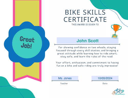 Celebrate every rider's progress with this bright and fun Bike Skills Certificate,  perfect for students who complete your bike rodeo or safety class!