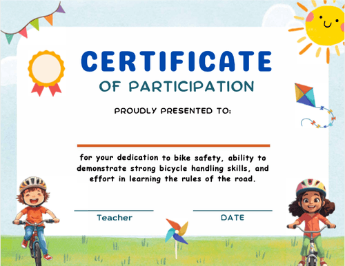 Reward young riders with this bright and cheerful Certificate of Participation, designed to celebrate their effort and enthusiasm during your bike rodeo or skills class!